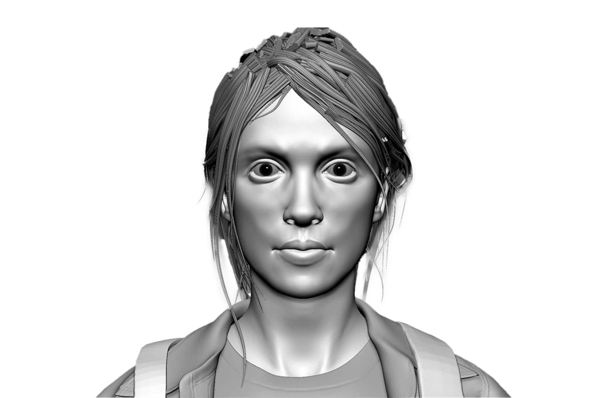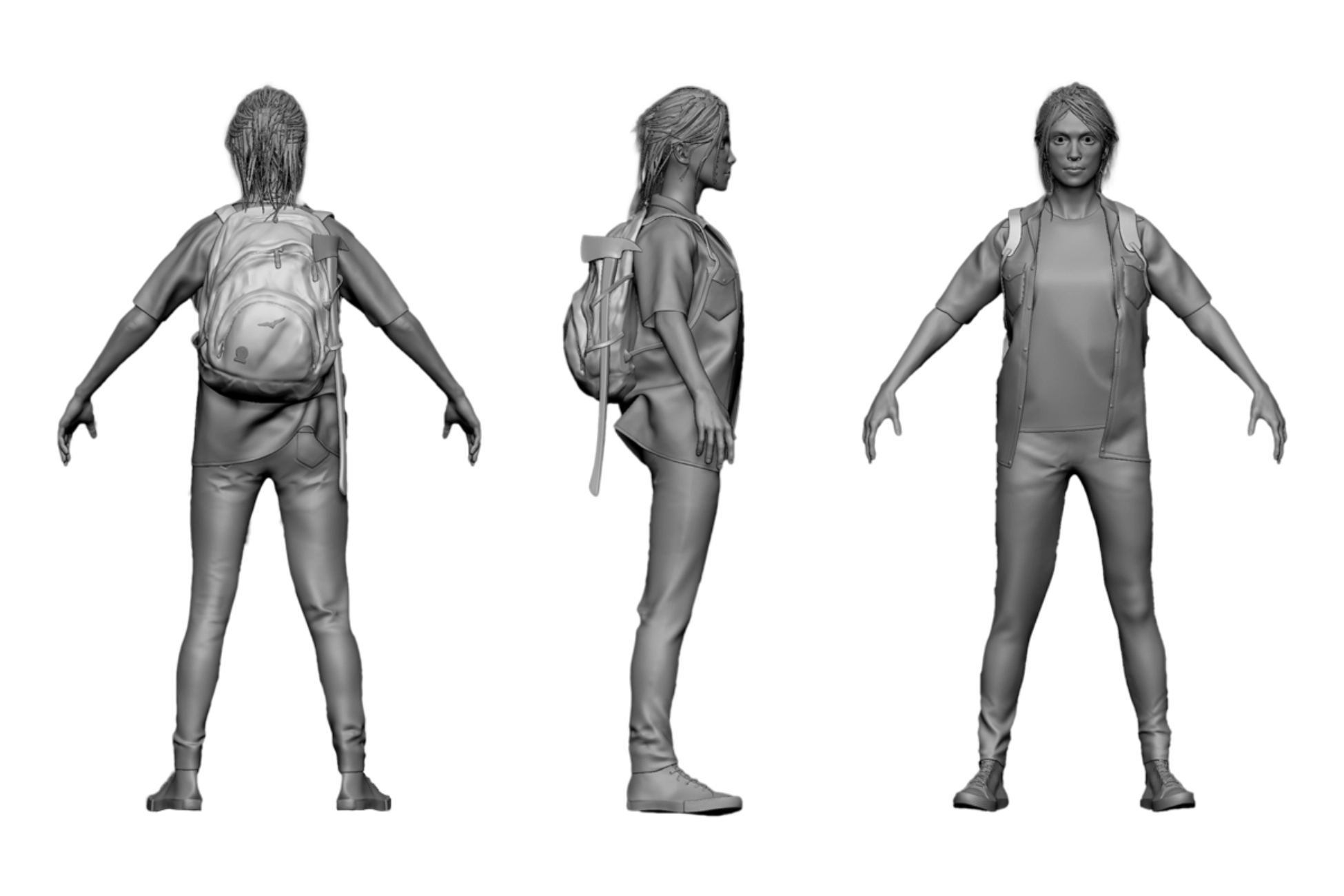 We wanted to shift a bit the tone established in the games so we were trying to make Ellie much more mature, to imagine her how it will look like in the future or in her 30s. A more defined jaw line and aged skin micro details.